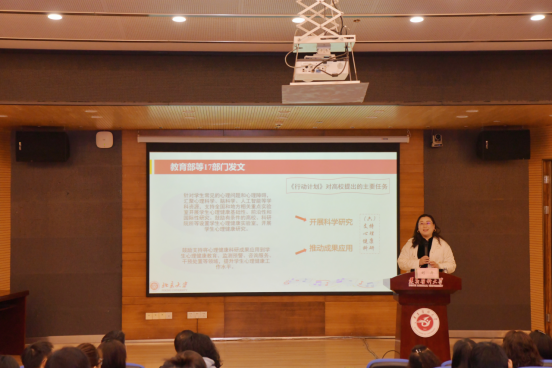 4月3日上午举办的三场专题讲座反响热烈,实现教师专业能力提升与学生心理素养培育的双向赋能。刘卉副教授以《学生异常心理识别与应对策略》为主题,结合典型案例,为200余名学工队伍成员解析心理危机识别与干预技巧;王豪坤老师系统介绍了北大“一站式”学生社区综合管理模式建设情况和驻楼辅导员工作机制,为优化我校学生工作体系提供新思路;刘泽华老师的《青年爱情观》讲座以心理学视角破解情感认知误区,450余名学生参与互动。