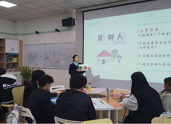 活动伊始,谢国秀老师以“自我介绍接龙”趣味小游戏进行开场,让同学们逐步放松进入到绘画环节。接着,谢国秀老师详细讲解了房树人、雨中人心理绘画流程及注意事项,同学们在舒缓的音乐中投入到房树人、雨中人的绘制中。最后,同学们在绘画结束后,逐一分享绘画作品内容、绘画前后心理体会以及内心感受到的温暖、放松和感动。